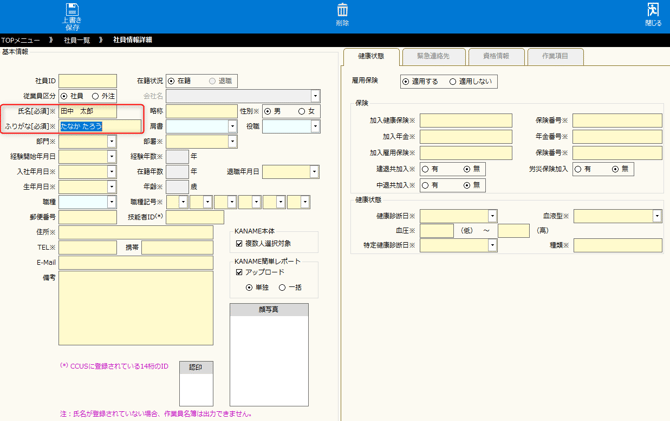 - 氏名、ふりがなを入力し、[上書き保存]をクリックします。