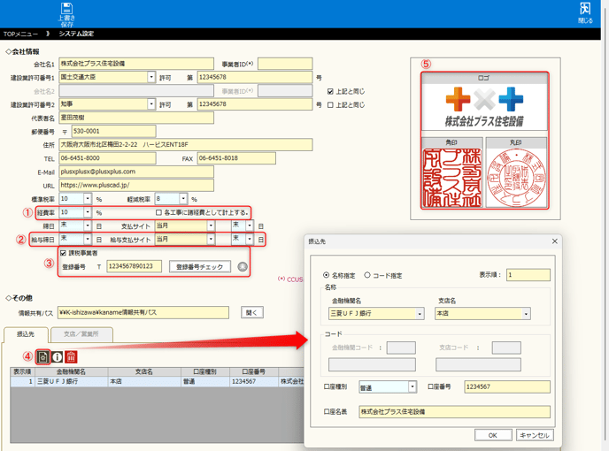 💡④振込先:入金口座を設定してください。ここに登録した情報が請求書を出力した際に振込先として表示されます。