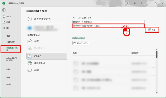 「ファイル」 → 「名前を付けて保存」 → 保存形式を「CSV UTF-8(コンマ区切り)(*.CSV)」を選択 → 「保存」をクリックします。