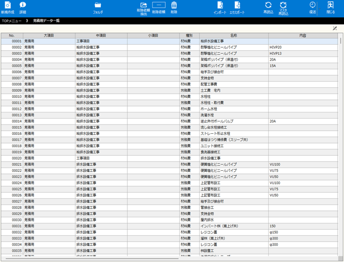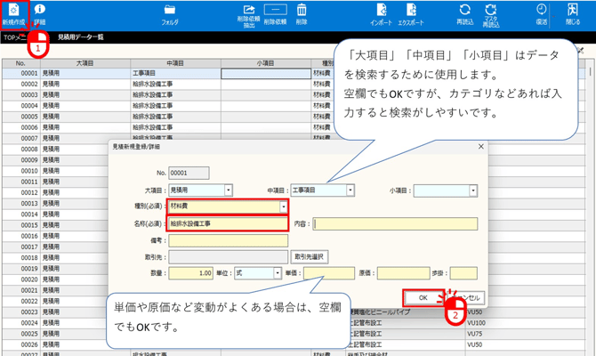 見積用データに登録することで、見積書作成時など「内訳取込」機能で名称などを呼び出すことができます。