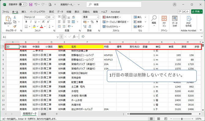 - 見積用データインポート用のExcelに取り込みたいデータを準備します。
